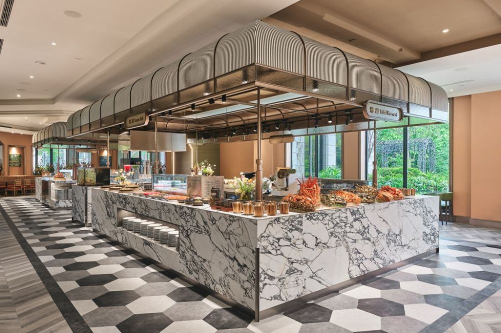 莫內饗宴以明亮法式風格與百道豐盛佳餚迎賓,彷彿置身歐洲高貴奢華饗宴。自助餐檯大理石紋理及線條展現現代沉穩與時尚俐落,外圍座位區花藝為歐式花園風格,3米高大面窗景及窗外綠樹藍天的光影,呈現沉浸動人璀璨的藝術氣息。