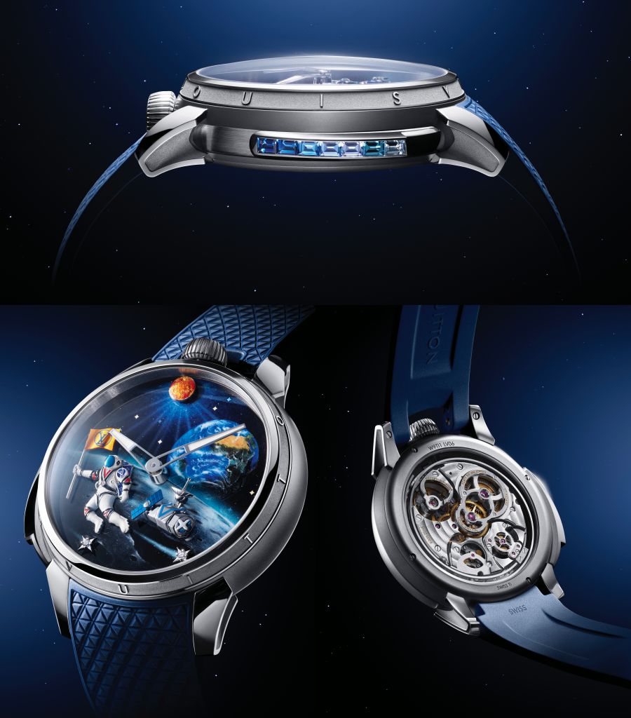 量身打造LFT AU14.02機芯,100小時動力儲備,46.7毫米鈦金與白金款。運用4種琺瑯工藝讓錶盤栩栩如生,由橘綠白藍色組成地球華麗色彩是層層微繪琺瑯完成。工匠們運用無可比擬的精密度,融合多種工藝技能,以 3D形態完美詮釋驚人和諧的銀河景象。
