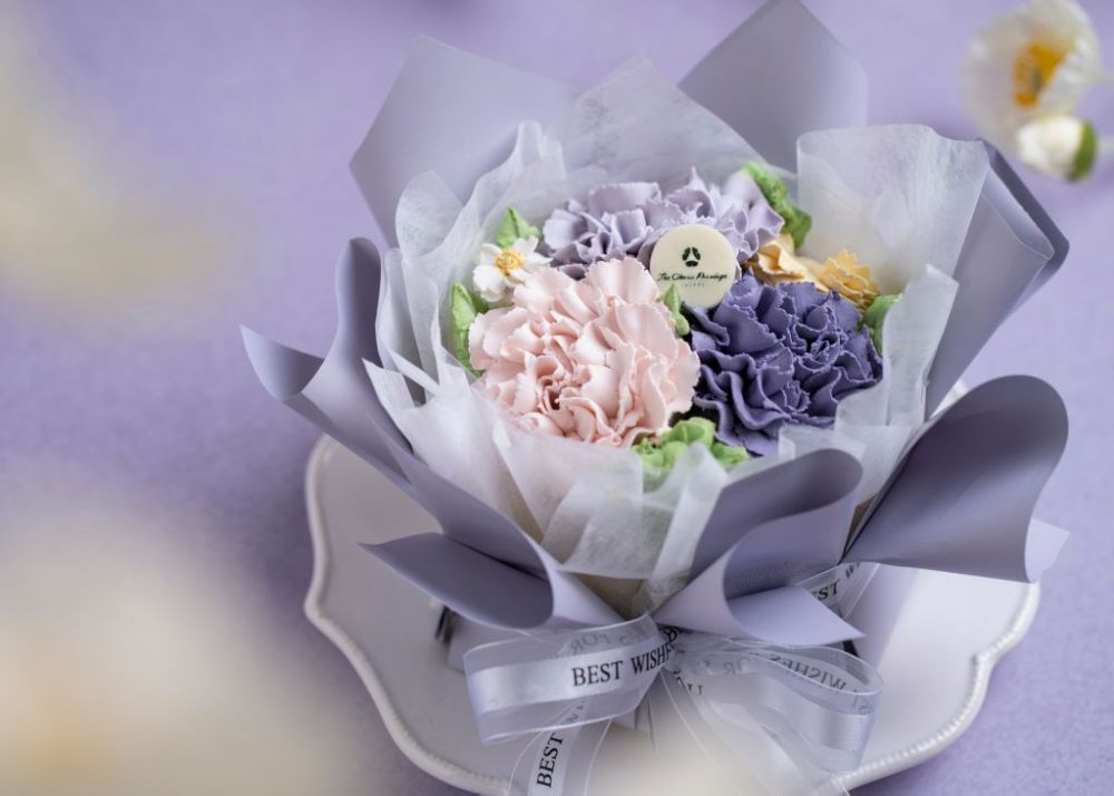 The Nine烘焙坊推出母親節限定蛋糕"紫語馨光"選用細緻柔軟白戚風蛋糕為基底,內餡融合紫米布丁與酒釀桂圓紅豆餡,風味溫潤細膩。頂層以豆沙餡手工擠製花朵,搭配花束式包裝外觀,仿若一束精緻花禮,如花甜蜜綻放。
