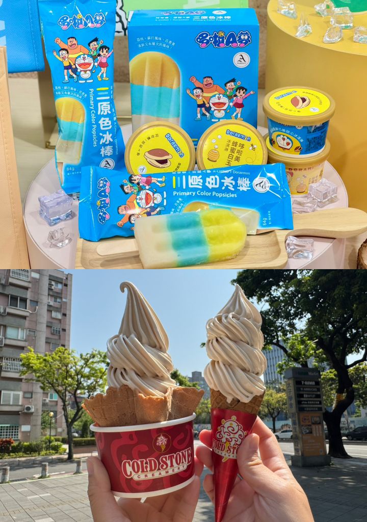 沁藍哆啦A夢聯名再度躍上冰品包裝,酷暑獨家新品哆啦A夢蜂蜜鬆餅巧脆甜心冰淇淋、阿奇儂哆啦美蜂蜜白玉冰淇淋與阿奇儂哆啦A夢三原色冰棒,能咀嚼到日本甜品必備經典Q彈白玉,豐富食感體驗。