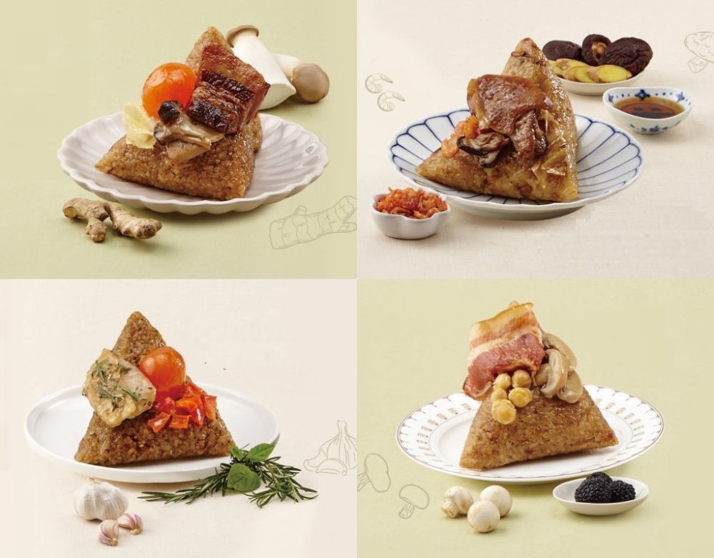 松露培根粽嚴選頂級松露醬及整片西式培根,飄散濃郁松露香氣,具層次豐富高級口感。義式香草雞腿粽以精心佐料調味義式香草雞腿肉,肉質軟嫩多汁,風味撲鼻。4款肉粽都能滿足所有人的味蕾。