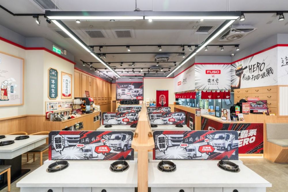 FUSO扛霸主題店內設計採用2D潮流漫畫風格,以幽默趣味方式融入FUSO品牌及扛霸系HERO英雄元素,生動展現職業駕駛與運匠們日常風貌,讓消費者在享用美味火鍋時,也能沉浸在輕鬆愉悅主題氛圍中,體驗獨一無二的美食與視覺享受。