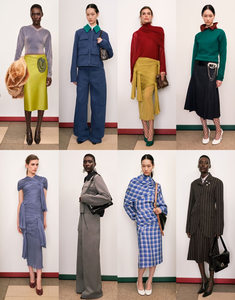 「實用工裝與學院元素經過煥新演繹,揉合非比尋常的夏翠絲綠與鈷藍配色及經典中性色調。」珠寶新作捕捉不羈態度,呈現巨型樹脂配以懸浮水晶耳環,及琺瑯材質稍縱即逝小雞造型别針。水鑽腰帶配飾裝點於A字半身裙與羊毛長褲,手工串珠小包如幸運小物般繫於腰間。