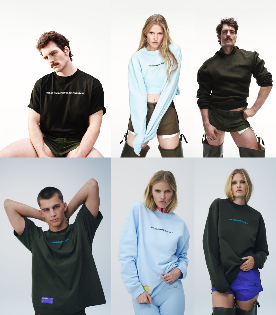 冰藍色Arctic Mist、神祕紫羅蘭色Violet Eclipse,與卡其、米色等自然大地色系構築強烈對比。上衣單品標語圖騰將寧靜與力量共存,"CAN YOU HEAR THE BIRDS"、"EMBRACE THE SILENCE"及"FIND ME WHERE THE WILDFLOWERS ARE”等詩意語句,呼應對大自然、沉靜與旅行深層思考。