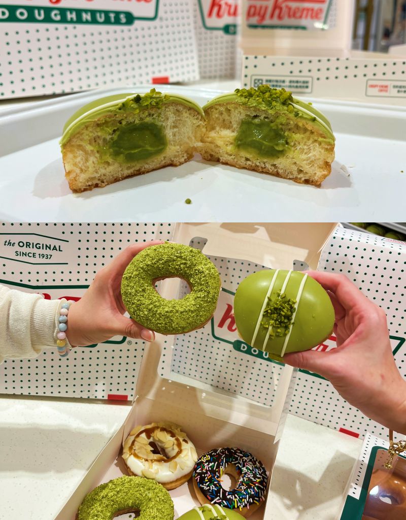 “雪點開心果"口感與名字同樣輕盈夢幻,經典糖霜甜甜圈淋上濃醇絲滑開心果巧克力,表層灑滿細緻開心果雪點酪乳粉,糖霜蜜香、堅果香與乳香交織,口感蓬鬆甜美,如初雪降臨般柔軟療癒,是夏季甜點清爽好選擇。只在台灣KRISPY KREME吃得到!