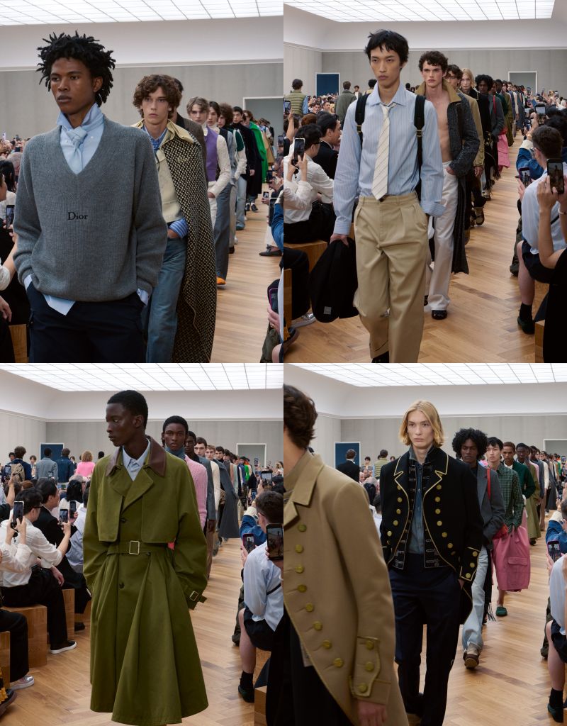 從開場BAR JACKET造型到燕尾服共67套造型,及忠實重製18~19世紀馬甲,愛爾蘭手工DONEGAL羊毛軟呢與軍裝領帶等面料與配飾亦悉數再現。點綴玫瑰、精細小巧刺繡與充滿洛可可風情DIORETTE吊飾,呼應Mr. Dior對英國文化與該時代的鍾情愛戀。