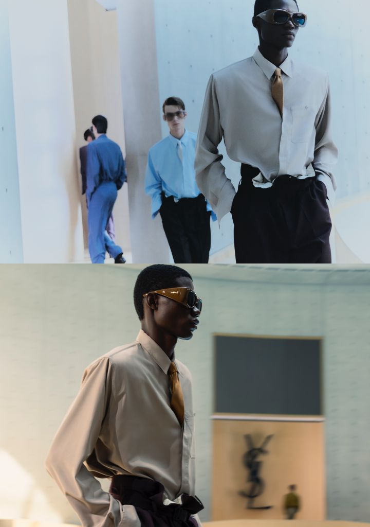本季男裝系列,Vaccarello沒有選擇夜色,而是獨鍾午後清麗陽光。 一種刻意的斷裂、沒有矯飾的光澤,乾淨的自然光暈,貫穿全場。一種幾何化的袒露,不為展示,而為承載。
