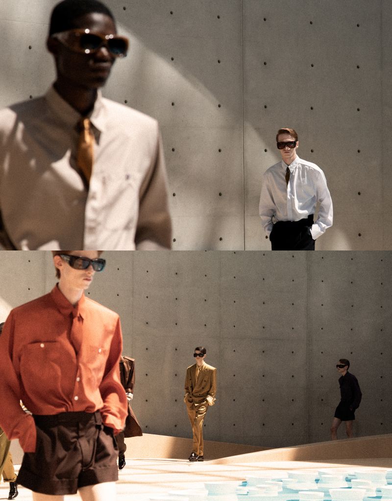 輪廓被雕琢,但非誇張。一切都顯得輕巧。造型輕盈,而不縛身。收腰設計、寬展肩線。 絲綢、尼龍等材質輕鬆勾勒身體線條,從細節低調改變男性輪廓,帶來嶄新美學。