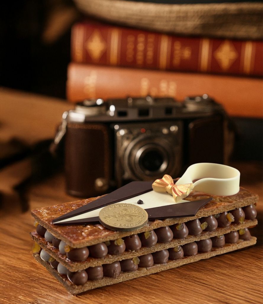 選用法國頂級法芙娜榛果巧克力製作慕斯,搭配法國柑曼香橙甜酒調製香緹奶油與義大利柑橘丁,在濃郁巧克力基調中增添一抹優雅酸香,口感層次分明、濃郁細緻,營造溫潤深邃法式風味。黑白巧克力手工雕製紳士西裝翻領與蝴蝶結裝飾,點綴金色巧克力幣,整體造型精緻、氣質沉穩,展現十足紳士風範。