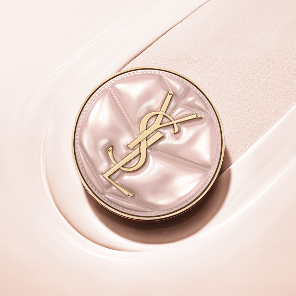 傳承自1980年代聖羅蘭高訂時裝垂墜裸粉緞面華服,將女性力量象徵柔粉緞光化作時髦配件,柔美不失率性,自信又細膩動人,將時尚美學注入彩妝工藝,精品氣墊演繹法式時尚靈魂。