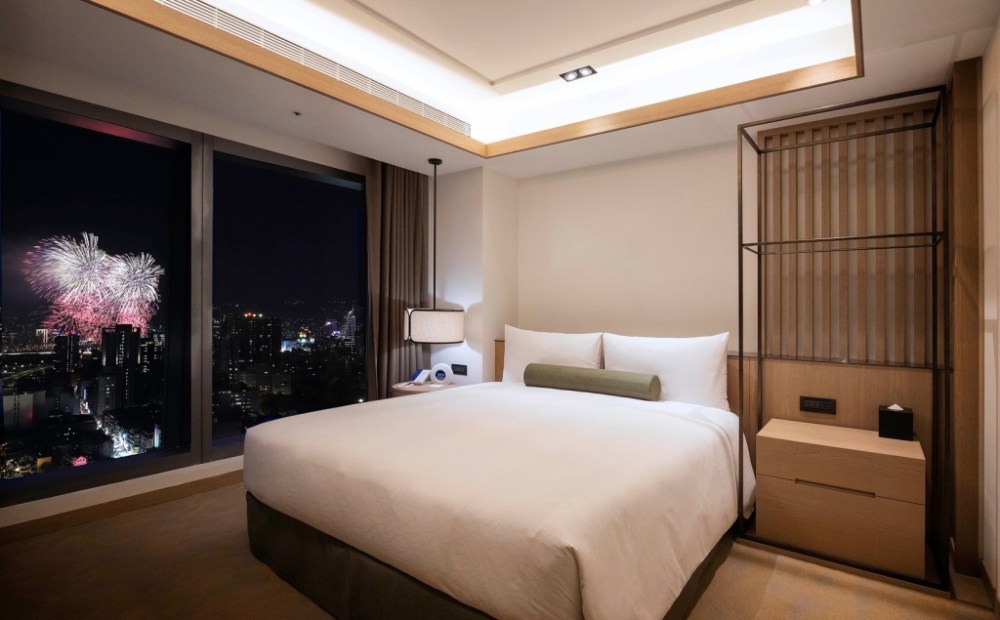若想升級打造浪漫約會體驗,可選擇豪華套房,擁有獨立客廳、寬敞臥室與景觀泡澡浴缸,猶如都會時尚精品豪宅居住空間,加碼贈送紅酒,邊賞煙火邊享受微醺片刻,實現一站式浪漫假期。