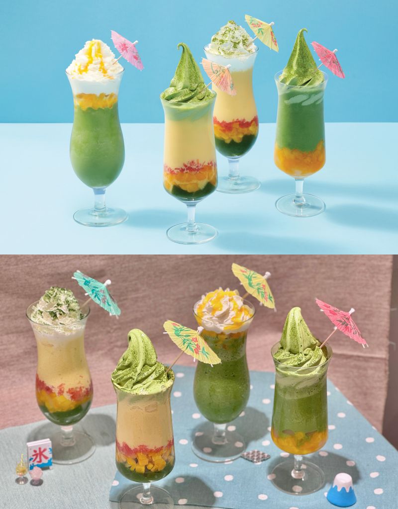 抹芒甘露冰沙&抹芒甘露漂浮以香氣濃郁台灣芒果為主軸,結合清爽優酪乳、滑順芒果雪酪與香醇椰奶,加入特製抹茶蕨餅、香甜芒果丁與微酸微苦葡萄柚果粒,堆疊出層次豐富夏日風味。抹芒優酪冰沙&抹芒優酪漂浮為濃郁版風味,完美融合宇治抹茶清新茶韻與優酪乳酸甜口感,帶來層次平衡、茶味鮮明夏日體驗。