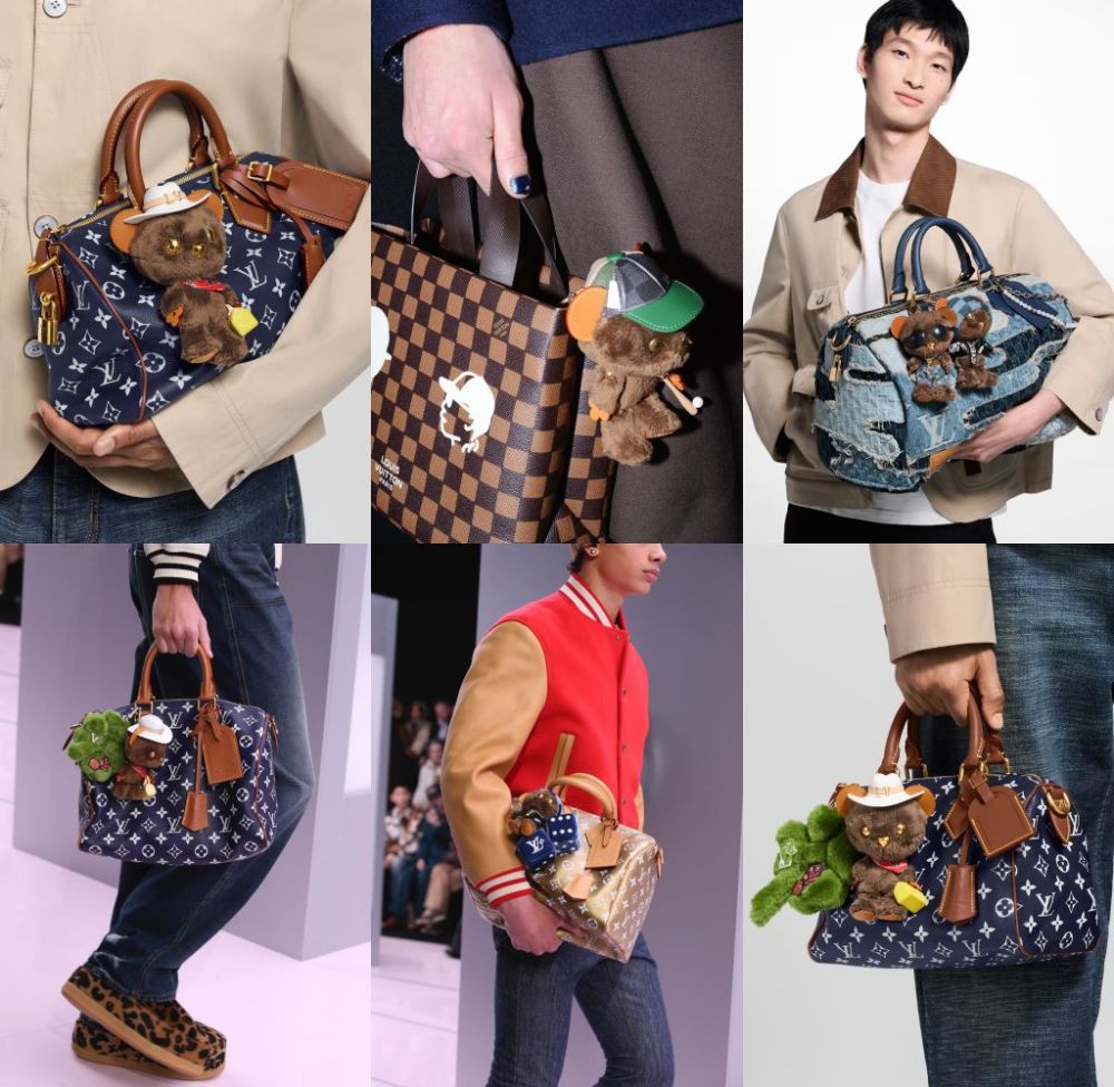 LV LOUIS BEAR吊飾配有金色金屬按扣,可以輕鬆搭配系列其他填充包配件,模糊骰子、心形與四葉草,每個都繡有標誌與標誌性硬箱插圖,及路易威登男裝2025秋冬時裝秀視覺主題多種款式皮革龍蝦或爪子。