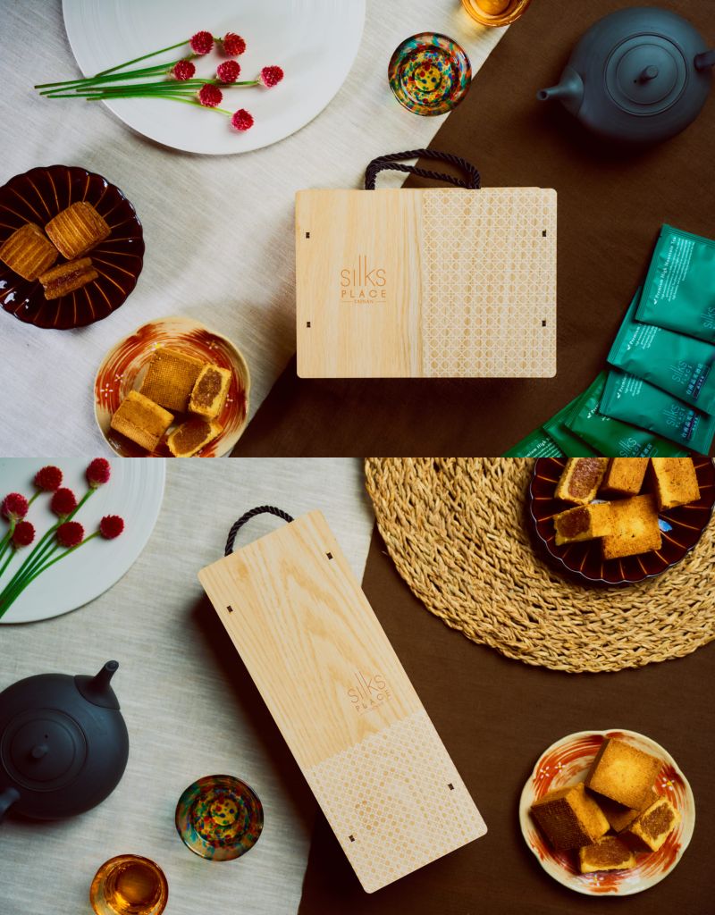 經典款盒中囊括2款鳳梨點心,口感酸甜細膩,隨盒各3顆酥餅搭配精選南投高山青茶與凍頂烏龍茶包,完美詮釋甜餅配茗茶精緻生活。雅致款8顆經典鳳梨酥盛裝於以東方窗櫺為靈感木盒,展現府城典雅風韻與內斂奢華品味。