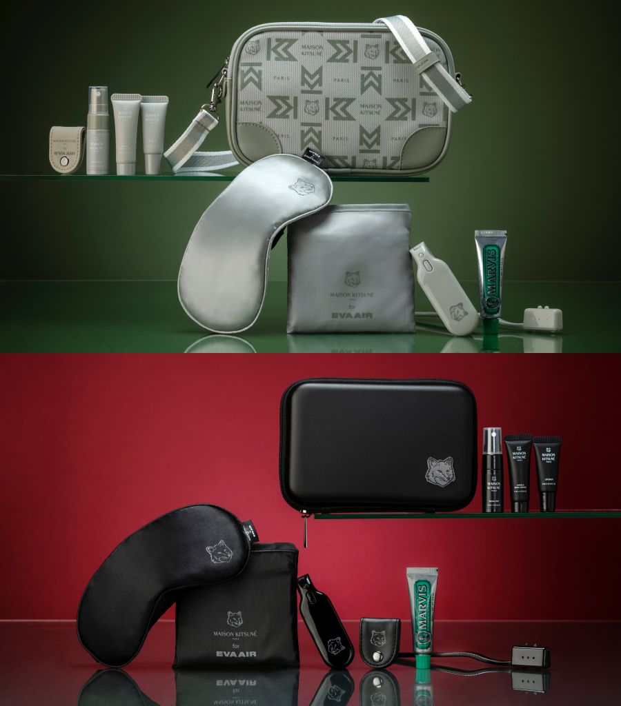 EVA Air長榮航空發表全新服務用品暨餐點,與法日潮流品牌MAISON KITSUNÉ小狐狸跨界合作,推出全套同款專屬過夜包、睡衣與拖鞋,將率先於10月開航的桃園—達拉斯航線使用。