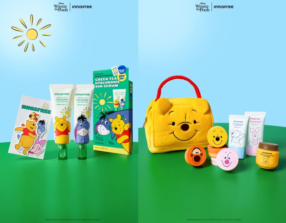包含綠茶玻尿酸保濕防曬精華、維他命C亮白潤色防曬霜、超級火山泥毛孔潔淨面膜、無油無慮礦物控油蜜粉等7款夏日必備明星商品。包裝印有彩繽紛又帶手繪質感的小熊維尼、跳跳虎、屹耳與小豬插圖,放在化妝包或擺在化妝台都可愛滿分。