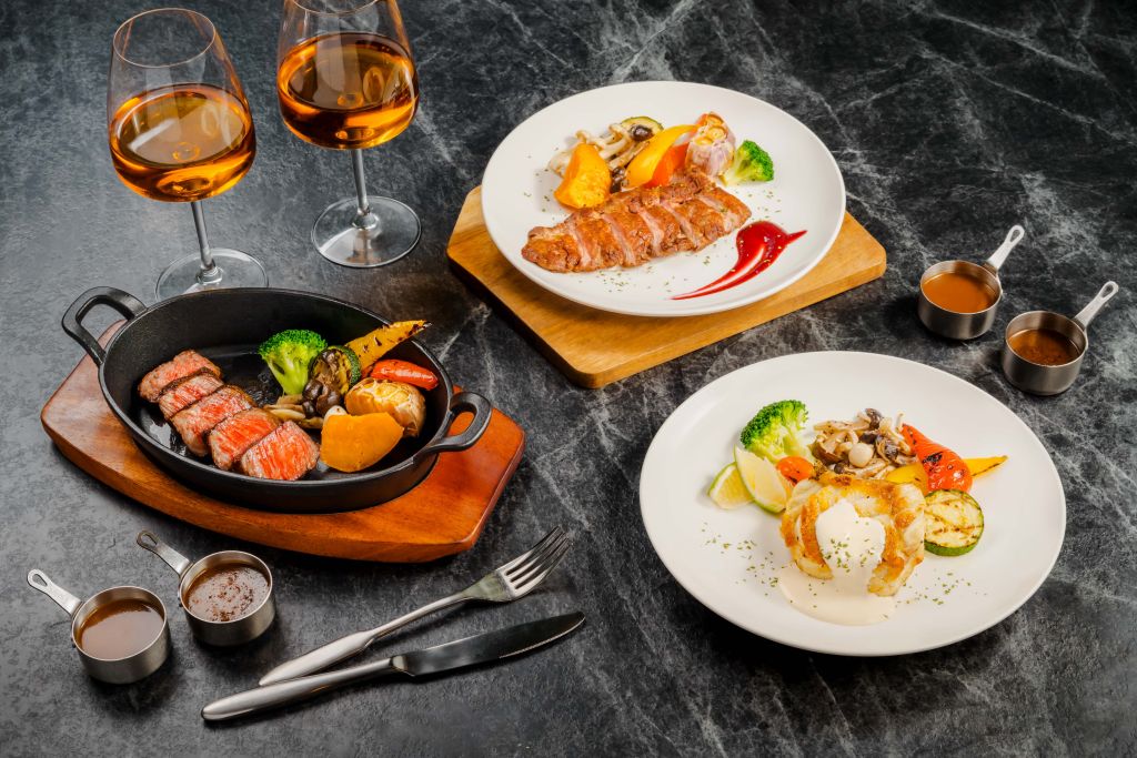 伊比利老饕豬佐莓果醬擁有肥瘦相間大理石紋,肉質緊實彈牙,脂香迷人。搭配近百道半自助吧,餐食特色涵蓋美式、義式、泰式、日式與台式多元風格,還有光焙若提供蔬食料理,在台北市中心稱得上是吸睛度爆表。