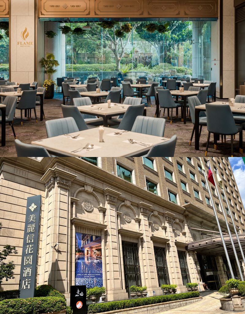 台北美麗信花園酒店全新青焰FLAME SIGNATURE視覺,餐廳呈現城市飯店典雅浪漫水池庭院綠意花園,附設獨特氛圍JIU BAR酒吧區,提供10多種紅白酒、台灣精釀啤酒、與多種經典調酒,譜奏浪漫感官饗宴!