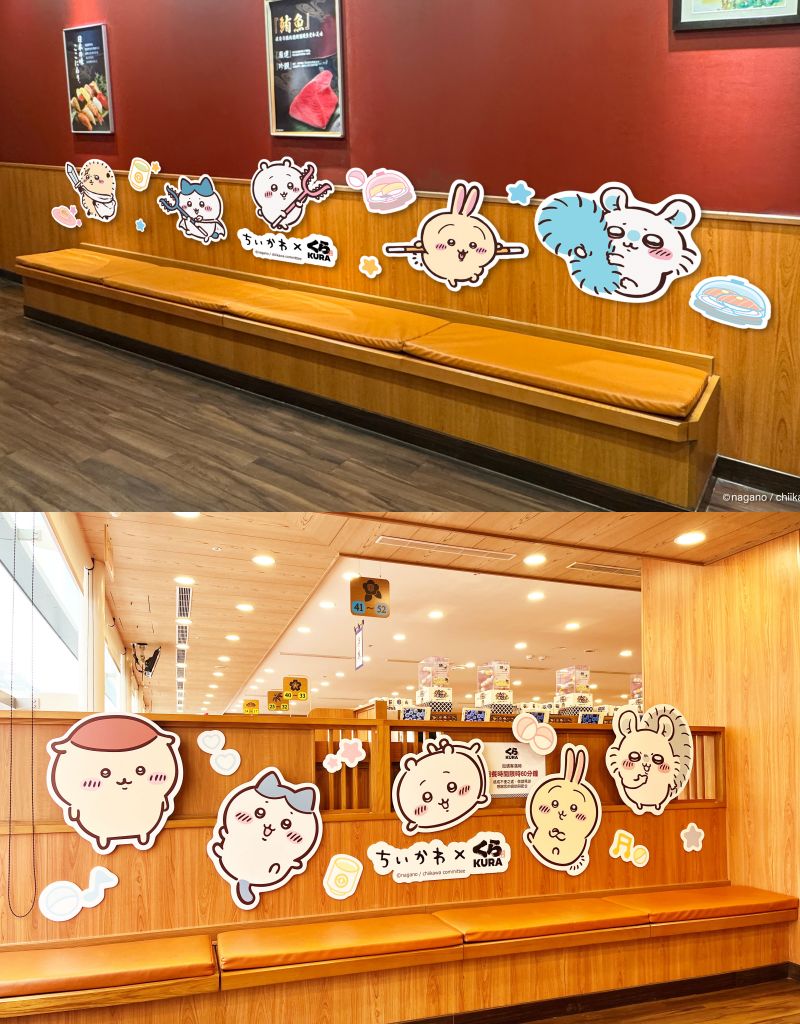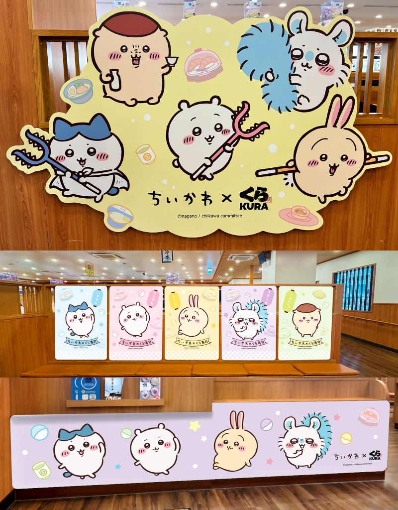 太幸福了!限定佈置店從迎賓大門、候位區到櫃檯區,全都換上吉伊卡哇佈置。吉伊卡哇、小八貓、兔兔3隻角色披上壽司小棉被,舒適地臥躺在鮮度君裡,模樣可愛又逗趣。粉絲們快把握機會來參與這場吉伊卡哇期間盛宴吧!