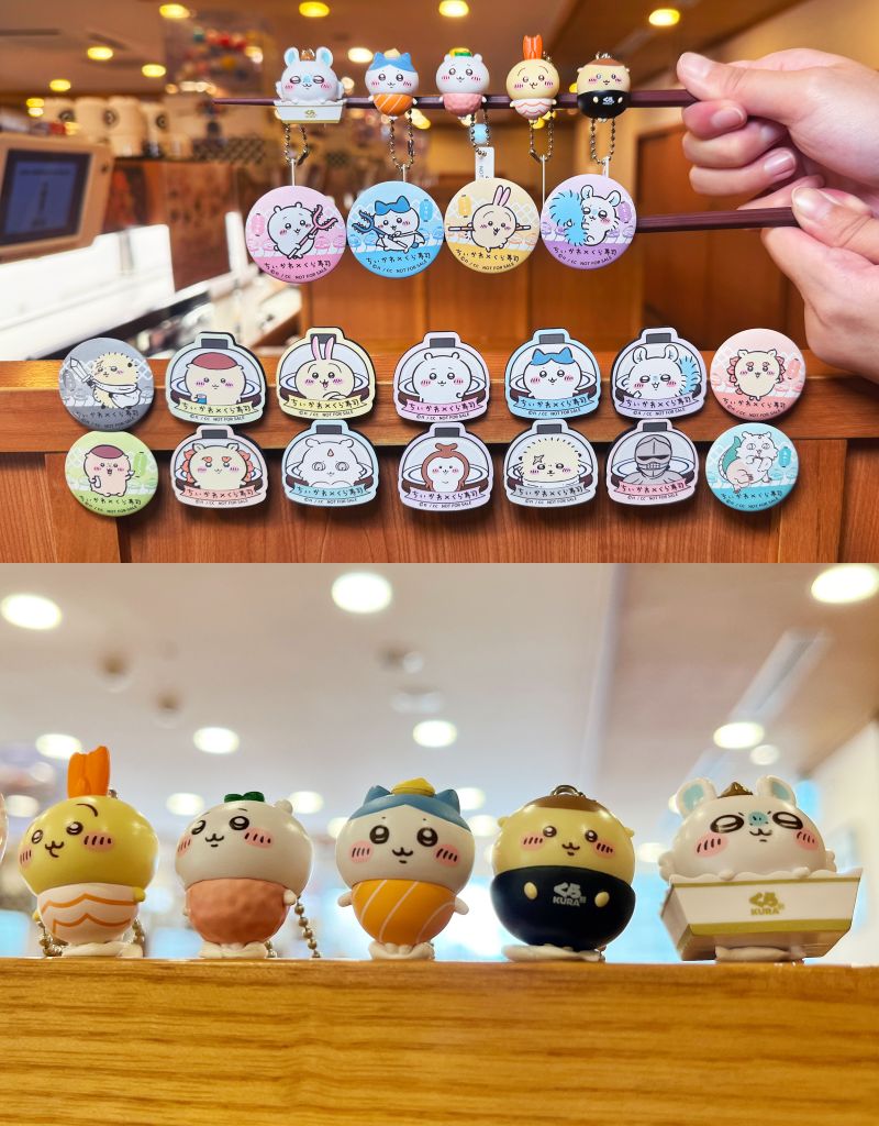立體吊飾中,吉伊卡哇穿上可愛的鮪魚壽司造型服飾,兔兔的長耳朵巧妙地化為鮮蝦壽司蝦尾,栗子饅頭以舒服地泡在湯品中造型亮相。徽章可以看到吉伊卡哇與朋友們手持武器,生動地在迴轉壽司帶上揮舞。