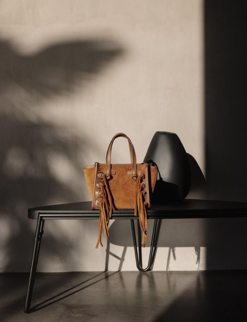 MISS MARCELLA麂皮扭結手提包FREE SPIRIT自由靈魂,麂皮包身搭配扭結、流蘇與鉚釘,焦糖色襯以黑鎳鉚釘,優雅中帶叛逆張力;純黑皮革款風格摩登強烈。