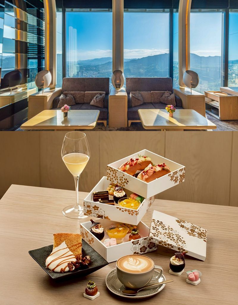 重箱下午茶套餐包含5款甜點、戚風蛋糕、鹹食、茶香檳與咖啡或茶,把一系列鹹甜美點以精緻方式呈現在三層重箱之中,搭配微風南山46樓高空景觀,是一場味蕾驚喜,也是視覺與心靈的滿足。品味日式雅緻,俯瞰台北天際線,享受城市中的靜謐饗食時光
