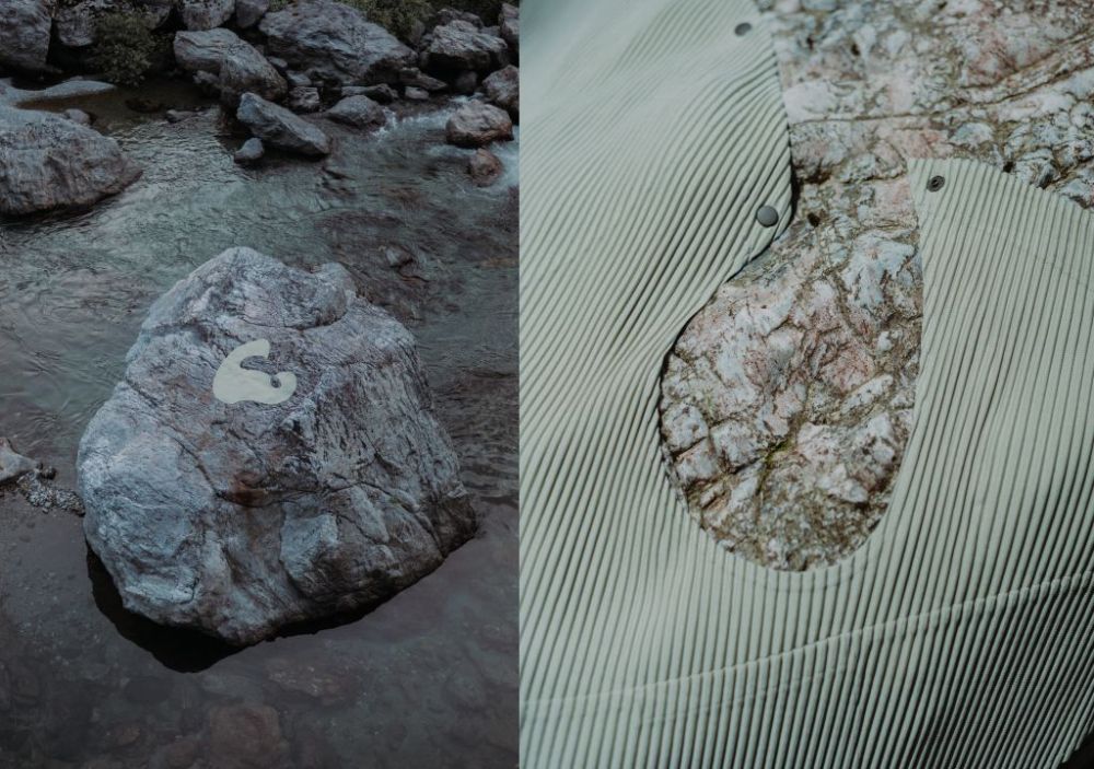 STONE CLOUD造型斗篷背心靈感源於岩石因水流與微生物侵蝕而形成的孔洞,設計師先轉化為平面形態,延伸為可環繞身體的立體服裝。隨機布設的釦子提供多樣穿法,讓服裝兼具藝術性與機能性。