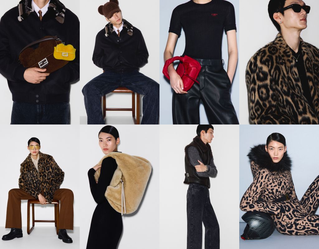動物紋印花圖案揉合經典檔案靈感FROSTED FAUNA,以黑白漸層融入煙草色與焦糖色朦朧暈染,FENDI LEO呈現張揚大膽豹紋圖案。印花廣泛運用於時裝、包袋及鞋履等多個品類,經過巧思變形適合都市冬日精緻日常穿搭,也能化為登山或戶外搶眼造型。