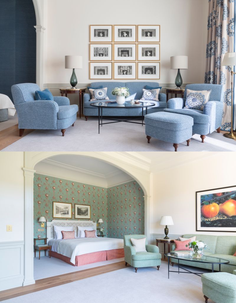 飯店採用精美印花布料、復古書桌及當地工匠訂製家具,營造濃厚藝術氛圍。陽光般珊瑚色、柔和粉藍、森林綠與象牙白色,搭配英國COLEFAX AND FOWLER、法國PIERRE FREY及DE GOURNAY織品與壁紙,為空間增添溫暖與質感。浴室使用光滑大理石、現代化照明系統與衛浴設備,完美融合傳統工藝與現代舒適。