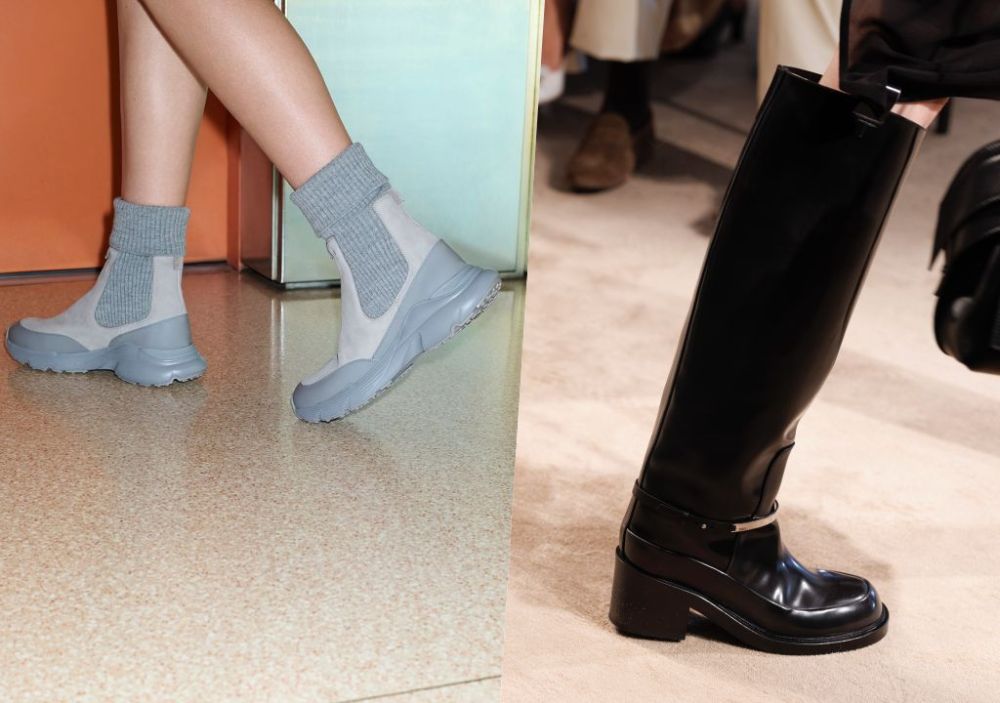 BARRETTA長靴結合馬靴與軍靴元素,展現剛柔並濟力量美。T字圓釦長靴與短靴以瑪莉珍鞋楦為原型,延續女性優雅韻味。針織襪套靴融合運動鞋與沙漠靴設計,輕鬆搭配日常造型。切爾西短靴靈感源自高跟樂福鞋,搭配超輕鞋底與經典豆豆後跟,兼顧舒適與時尚。