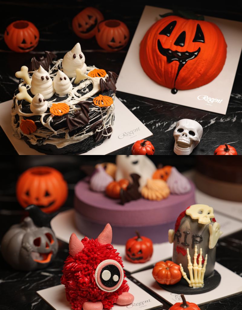 點心房法籍主廚羅倫(Delcourt Laurent)再度發揮驚人巧思,將REGENT GIFT SHOP打造成萬聖甜點屋,供應黯夜黑絲絨蛋糕、午夜南瓜榛果巧克力、黯黑蝙蝠抹茶慕斯等多款造型俏皮可愛、精緻可口的甜品,兼具趣味及美味,營造萬聖節詭譎無限創意。