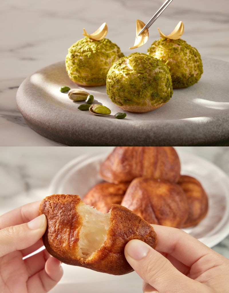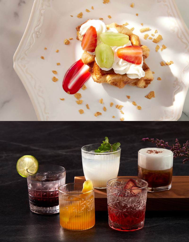甜品搭配WEDGWOOD英國皇室骨瓷餐盤,設計靈感源自世界各地文化風情,為整體饗宴更添美學氣韻。現場呈現青葡萄香堤塔、榛果巧克力蛋糕與焦糖爆米花等超過20款歐式精品級甜品,搭配現點現做開心果泡芙與假日限定脆皮可頌鬆餅,奶油年糕、香草與巧克力2種風味甜甜圈等,讓甜蜜滋味延伸至每個角落。