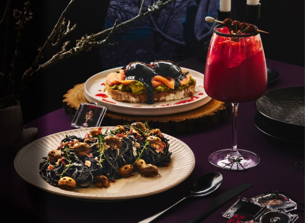 幽靈毒酒櫻桃飲萬聖夜限定深紅如血調飲,龍舌蘭搭配櫻桃、接骨木、檸檬與香吉士,串上的帶辣意酒漬櫻桃,彷彿魅影在身旁,每口都刺激又詭異。黑森林蘑菇辣黑麵濃郁白醬與墨魚麵交織,培根與新鮮蘑菇釋放陰森香氣,百里香點綴其中微辣刺激味蕾,像置身黑森林深處未知恐懼中,挑戰來到黑暗餐桌的膽量。
