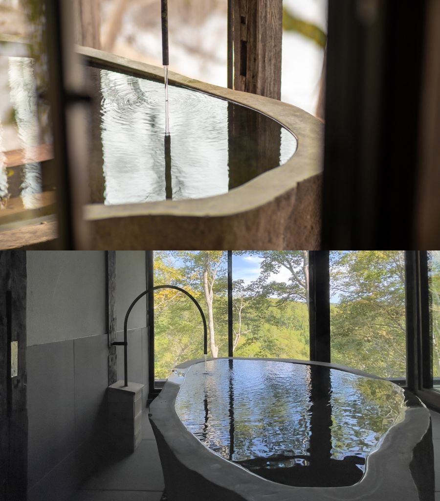 當然温泉更是一絕了,所有客房內都設有全天候可享用的源泉掛流,完全不加熱、不加水的溫泉,100%流動的源泉。一個檜木池及採用一整塊石頭打造的大池,都調整到極舒適恰當的温度,當山谷裡的涼風吹進來,透過能一覽大自然全景的窗戶,望著隨時間流逝變化而呈現如同畫作般流動的景色,泡再久都不悶不躁。