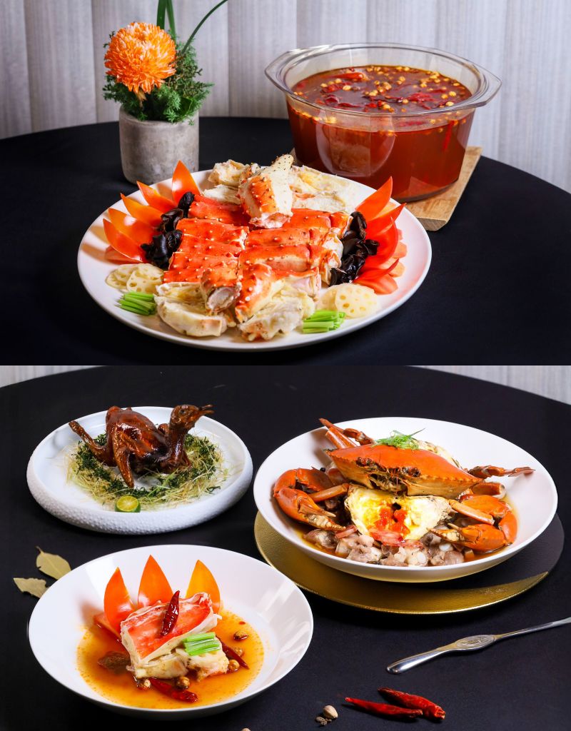 紅蟳花雕蒸以花雕酒香提鮮,蟹肉細嫩甘甜、酒香飄逸,風味層次豐富。星洲香辣蟹以辛香炒料爆香入味,辣中帶甘。金絲香麥軟殼蟹以香酥麥片包裹炸至金黃軟殼蟹,外酥內嫩、香氣撲鼻。避風塘軟殼蟹以蒜酥香氣與辣椒香襯托蟹香,鹹香惹味。腐竹銀杏胡椒豬肚雞湯湯頭濃郁溫潤,入口回甘、暖胃生津,豬肚Q彈脆口。另有麻油松阪豬腰、雞煲蟹粥、紅蟳米糕等料理驚艷登場。