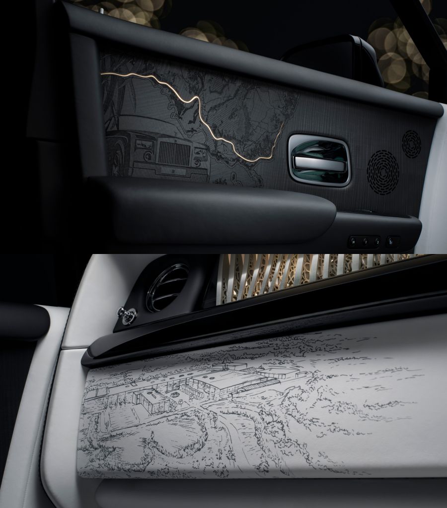 專屬典藏版系列配備勞斯萊斯汽車作品最複雜精巧木藝,染色黑木(BLACKWOOD)打造車門飾板描繪車款歷史上最非凡最關鍵的旅程。每幅構圖地形地貌、蜿蜒路線、壯麗景色、花卉元素及試驗車型描繪交織一起,呈現描述PHANTOM傳承脈絡的生動藝術作品。