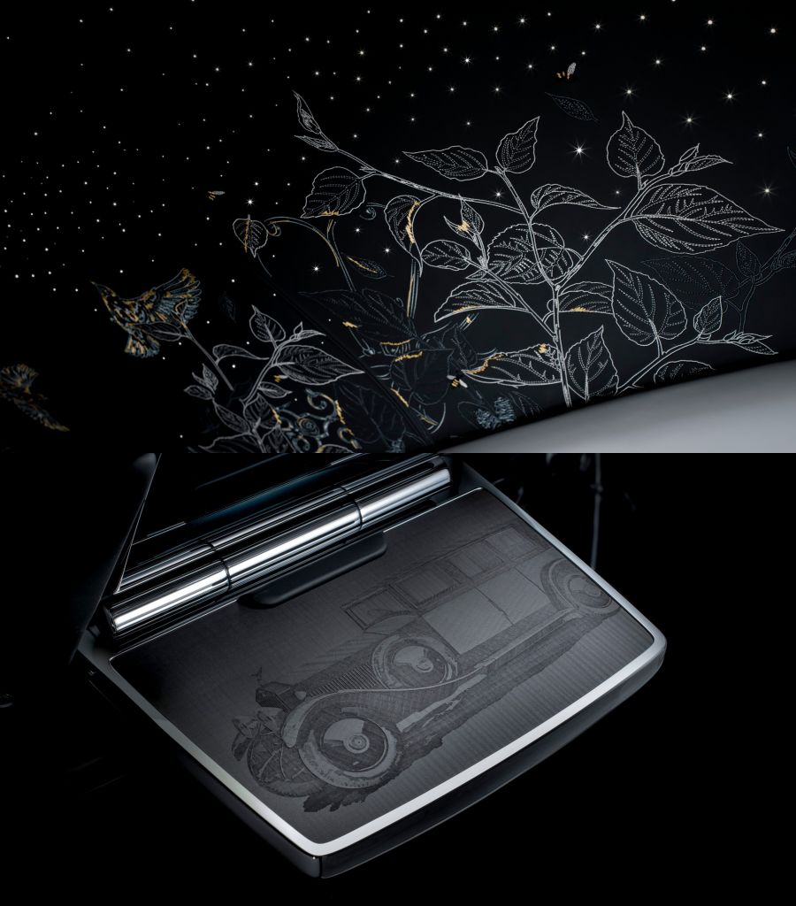 車門飾板作品通過鐳射以3種不同深度蝕刻於木質飾板,代表以24K金箔璨然呈現旅程道路,每條軌跡均由厚度僅0.1微米方形金箔精心匠制、精密切割並手工鋪設而成。後排野餐桌分別蝕刻1925年原版PHANTOM I與PHANTOM VIII非凡風姿。2款車型鏡像圖案刺繡於野餐桌背面皮革飾面,將過去與當下巧妙連結設計。