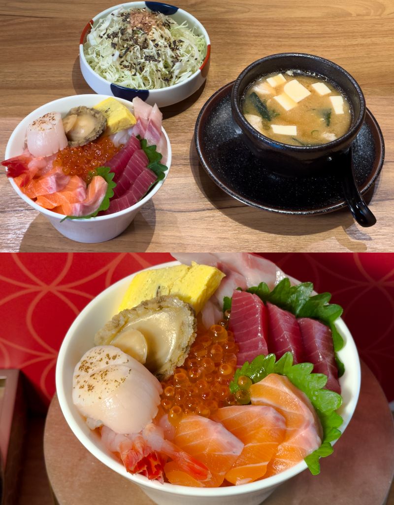 華麗綜合海鮮丼豪華匯集鮪魚、日本青魽、鮭魚、玉子燒、炙燒干貝、甜蝦、鮑魚磯煮、鮭魚卵、花枝等9大新鮮海味,每口都像大海親自來敲門,鮮度滿點。搭配清爽脆口鹽昆布拌高麗菜沙拉與濃郁甘醇鮮魚味噌湯,層次豐富、節奏完整,一口接一口停不下來。