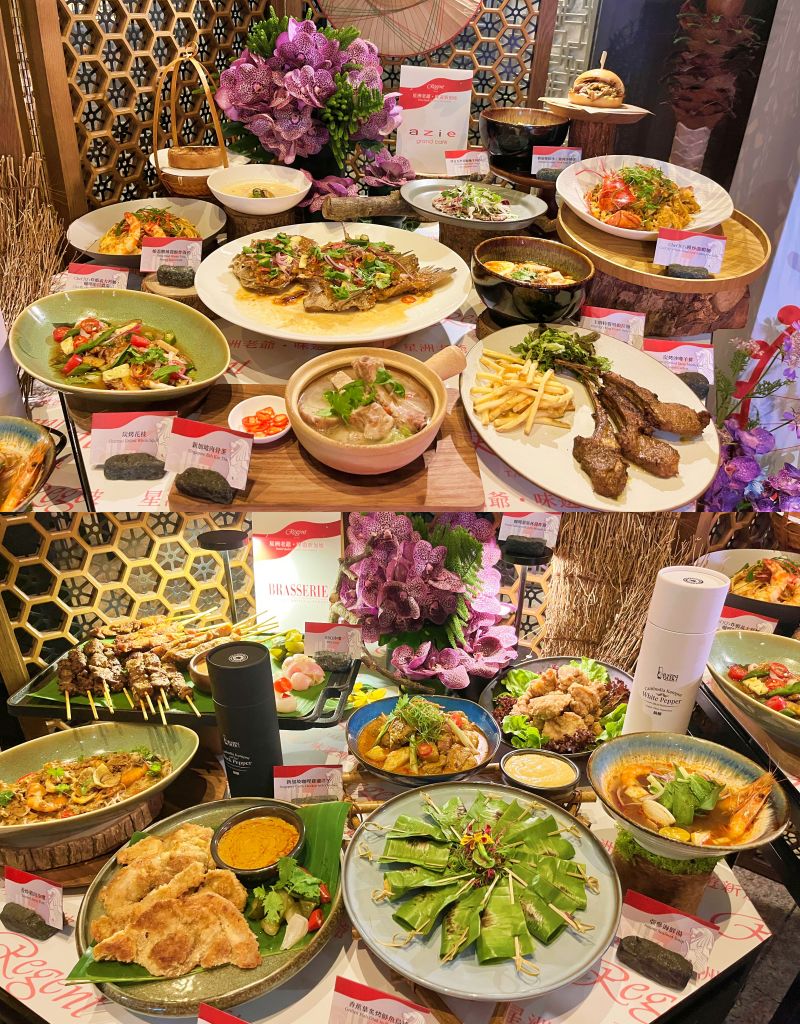 柏麗廳自助餐以沉浸式星洲市集為主題,料理滿佈餐檯,空間佈置重現熱帶南洋節慶氛圍,食客可以品嘗到星洲咖哩雞襯洋芋、香蕉葉炙烤鮮魚烏達、香烤豬肉沙嗲等,現場設立新加坡叻沙麵與鮮蝦拉麵現烹專區,食物香氣與熱氣氤氳,彷彿置身新加坡街頭,感受熱情奔放的熱帶氣息。