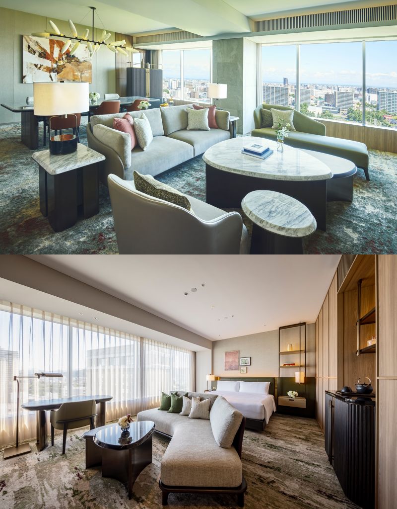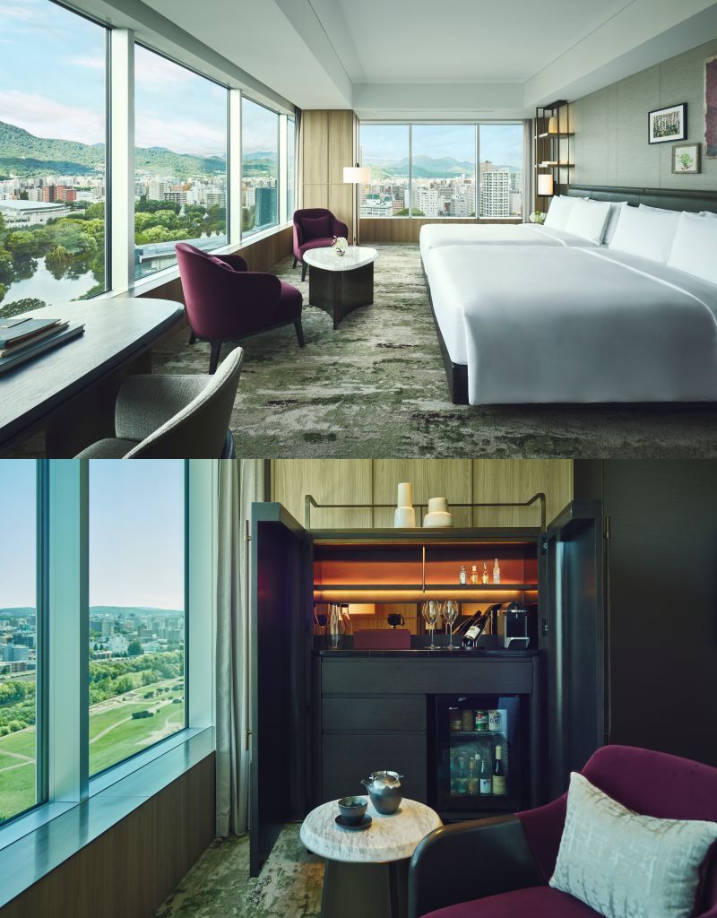 飯店擁有149間優雅客房含13間套房,風格簡約溫暖柔和,設計概念旨在打造如同私人住宅般舒適體驗,提供精緻溫馨入住體驗與恢弘氣派。溫暖大地色調靈感源自北海道自然美景,營造寧靜雅緻氛圍,大片落地窗將中島公園與豐平川的瑰麗美景盡收眼底。