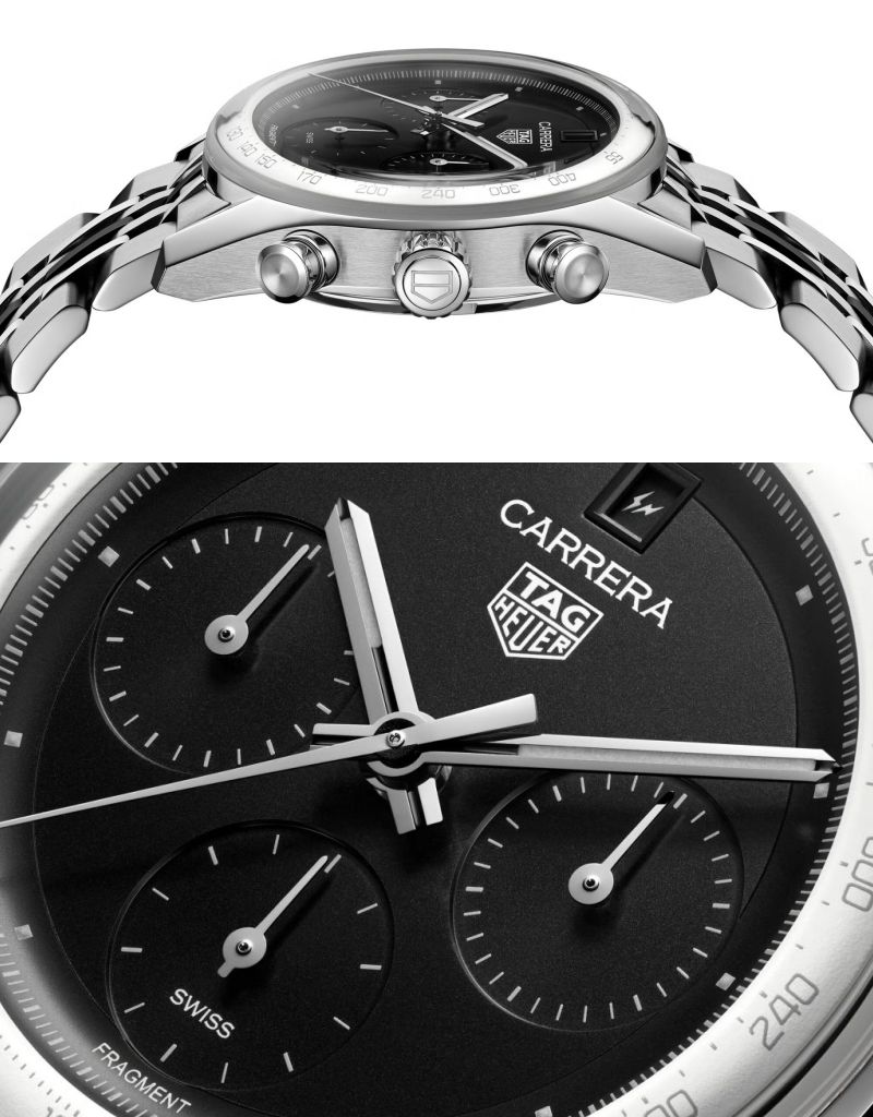 TAG HEUER CARRERA CHRONOGRAPH╳FRAGMENT聯名限量版計時腕錶以俐落美學重新演繹,獨特拱形結構、標誌性弧形凸緣、對比鮮明白色外凸緣測速計刻度圈、黑中帶黑錶盤、特別設計的日期盤1與11日期融入FRAGMENT標誌,巧妙呼應招牌閃電符號。