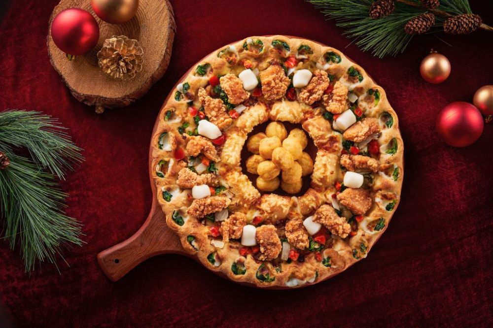 睽違4年,PIZZA HUT必勝客聖誕花圈比薩經典限時3週限量回歸!全新改版聖誕花圈黃金雞比薩整體肉量升級,花圈中央豪邁放入滿滿酥炸嫩雞球,口感酥脆又過癮,每口都吃得超滿足。