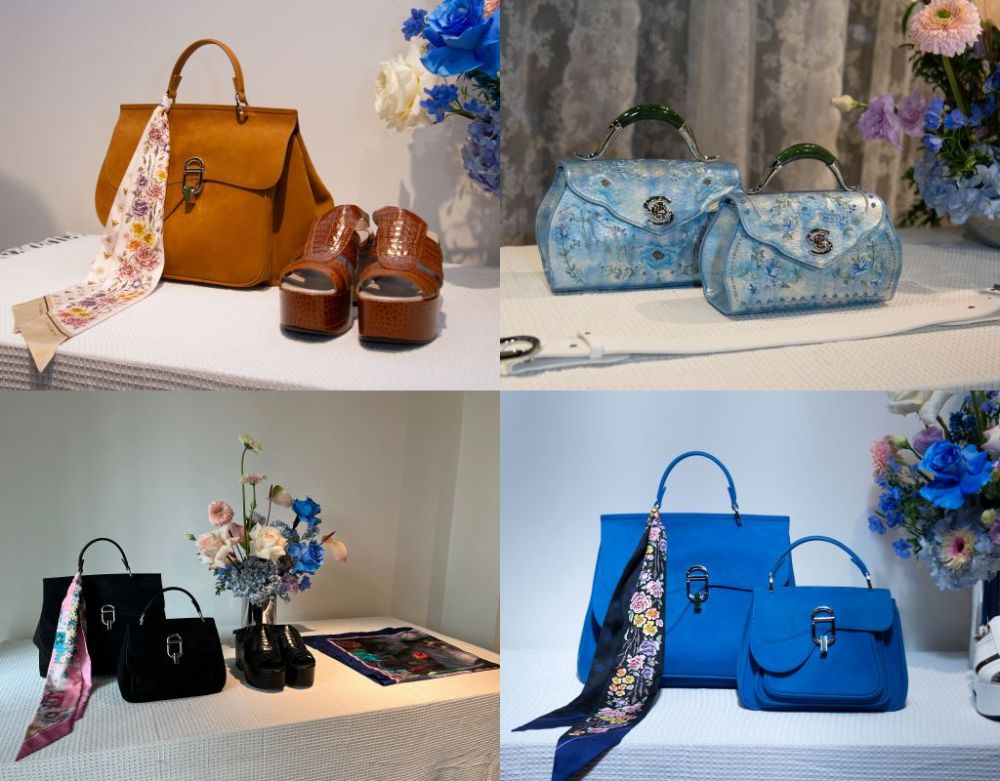 手作精神的當代語彙,丹寧與皮件著重自然肌理,玉鐲包以金屬感炫光波紋打造VINTAGE質感牛皮,以緞帶繡層層堆疊出馬奔馳於花園圖騰意象,讓柔美與力量並置,呈現摩登又富詩性工藝張力。
