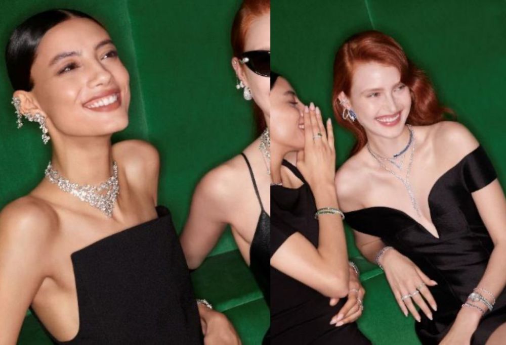 18K黃金套索項鍊以Y字線性結構延展鎖骨線條,於視覺呈現縱向垂墜效果,以鏤空卵形墜飾構築目光落點,為造型注入光感層次與時髦張力。耳環與手鍊佩戴則提升整體風格適度份量,與黑色或灰調服裝優雅並置,展現都會質感調性。