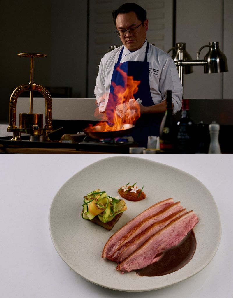 西餐廳主廚黃國維嚴選彰化高床與卵石地悉心培育70天頂級胭脂鴨,經風乾、低溫烤製到高溫上色等工序,打造外酥內嫩細膩口感。展現這道料理靈魂莫過於在饕客桌邊將鴨骨榨取出的鴨血與骨髓化作濃郁醬汁,從骨到肉完整展現法菜質樸精神與深厚底蘊。