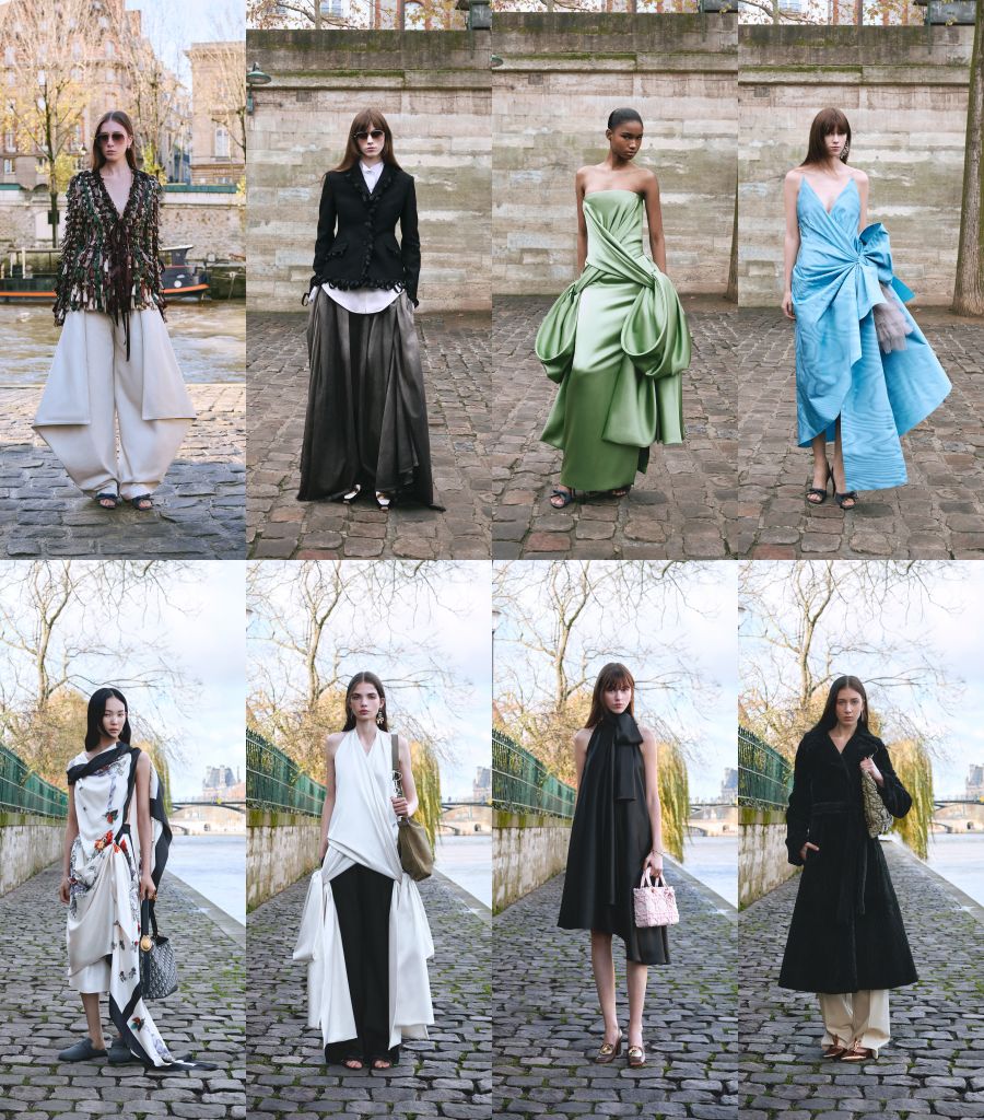 全新一季時裝風格核心聚焦於單品本身及轉化的可能性:經典BAR JACKET短版剪裁搭配柔軟面料呈現,甚至放大為外套;貼身包覆感極強的大衣外套、針織斗篷、垂墜式洋裝、寬版絲質丹寧長褲,及帶層次雕塑感、極具戲劇張力側向綻放禮服造型,層層鋪陳多樣姿態。