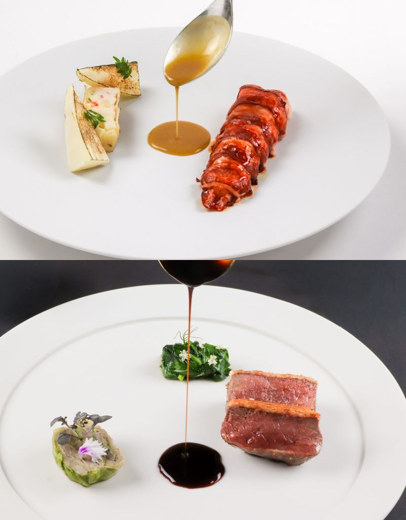 頂奢主餐融合山海並行,深邃浪漫味覺饗宴。日本A5和牛口感柔嫩多汁,呈現近似3分熟細緻質感,醬汁清透辛辣,整體風味清新鮮明、飽滿豐富優雅。法國藍龍蝦以清蒸烹煮保留龍蝦及竹筍最純粹彈性與鮮甜,演繹海與山並行美味饗宴。