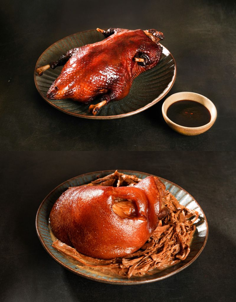 老北京醬鴨來自李崗對母親家鄉味深刻記憶,遵循北方傳統繁複工法,歷經醃、炸、滷等多重工序,鴨皮Q彈、鴨肉細嫩,醬香沉穩厚實。筍絲蹄膀把江浙料理細膩發揮極致,膠質豐潤入口即化,層次分明不膩口,紹興酒與冰糖慢慢收斂出醇厚湯色,像年夜飯桌上最安靜卻最有存在感的2道經典年菜。