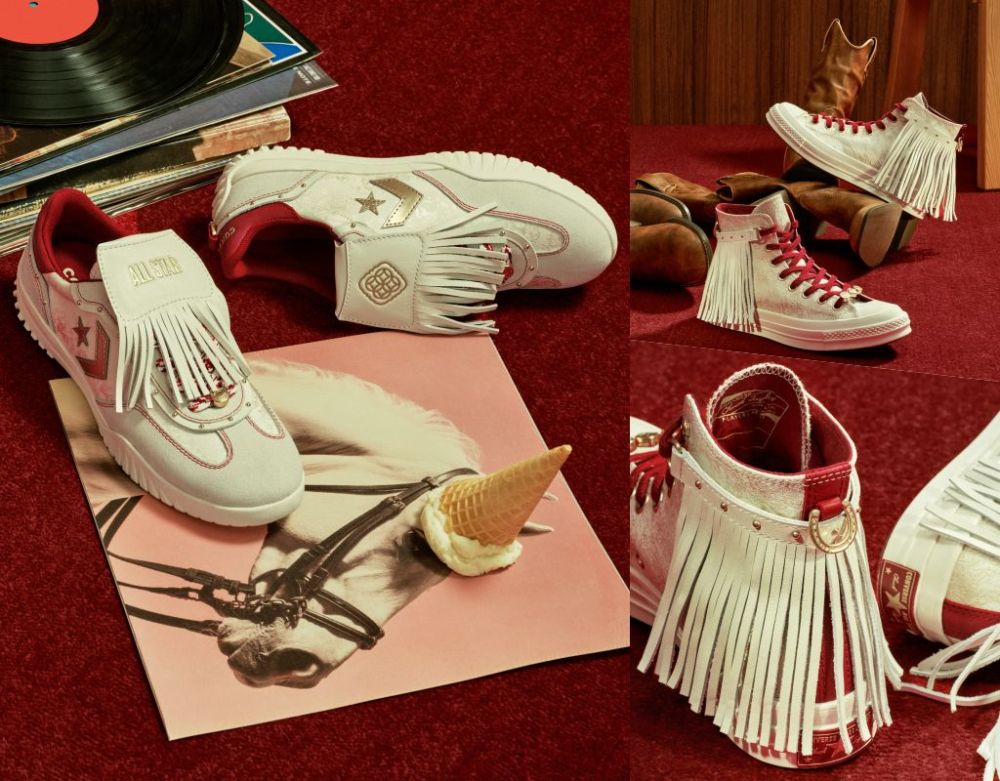 CHUCK 70馬年流蘇版紅白配色撞擊視覺張力,結合金色馬蹄D型環,在經典輪廓勾勒動感之美,打造喜慶又時髦節慶穿搭。RUN STAR TRAINER馬年流蘇版流暢線條延續復古運動風格,鞋跟星箭LOGO與馬蹄D型環細節暗藏巧思,讓好運一路相隨。