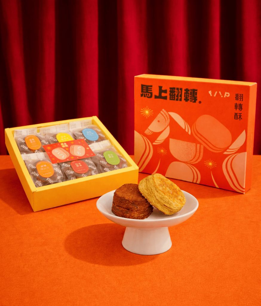 翻轉酥顛覆傳統鳳梨酥與蛋黃酥,憑三重翻轉重新定義酥餅美學,翻轉結構將精華餡料置於中心,視覺與味覺同步綻放。翻轉口感選用高級法國麵粉與荷蘭皇家奶油,創造層層酥鬆、輕盈不乾碎理想層次。翻轉心情附贈翻轉小卡,藏著專屬馬年開運金句,翻轉新年美好。